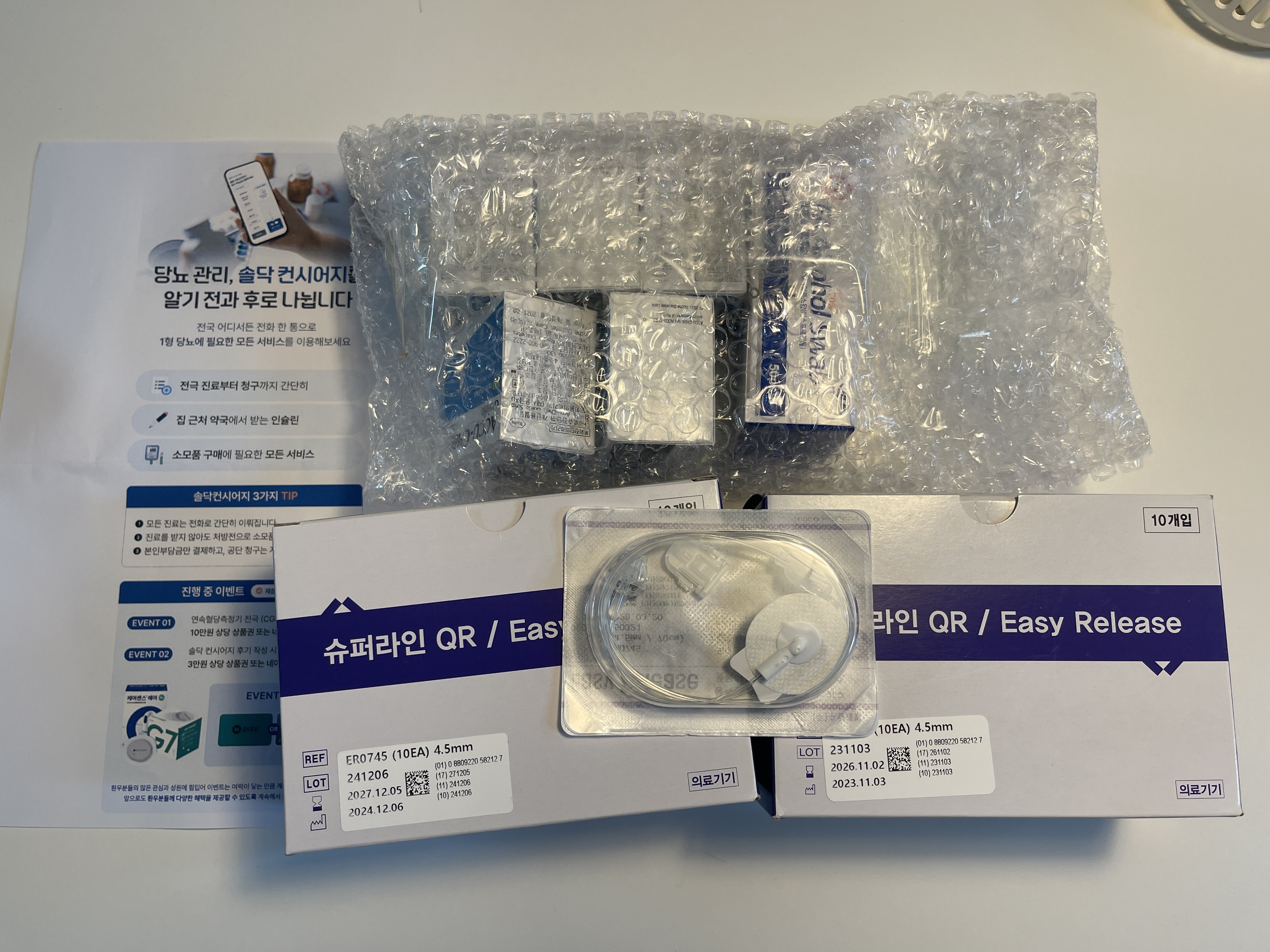 저는 이번에 혈당 측정에 필요한 Accu-Chek 시험지, FA 알코올 스왑, 그리고 슈퍼라인 QR 세트를 주문했어요.