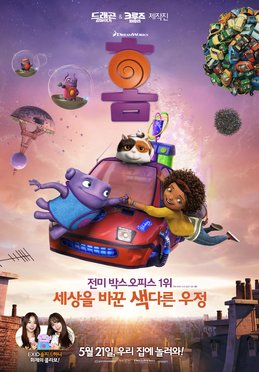 영화의 장점은 캐릭터의 매력과 유머감각입니다. 오는 보브 부족에서 가장 이상한 외계인으로, 자신만의 언어와 행동을 가지고 있습니다. 그는 인간의 문화와 감정에 대해 배우면서 많은 실수와 재미난 상황을 만들어냅니다. 예를 들어, 그는 인간의 욕실을 사용하는 법을 모르고, 휴지를 먹거나 화장실에 물건을 버리는 등의 장난을 칩니다. 또한 그는 인간의 말을 따라하거나 음악에 맞춰 춤을 추는 등의 귀여운 모습을 보여줍니다. 티프는 오와 달리 성격이 강하고 용감한 소녀로, 자신의 엄마를 찾기 위해 노력합니다. 그녀는 오와 처음 만났을 때부터 그를 싫어하고, 그를 쫓아내려고 합니다. 하지만 그녀도 오와에게 도움을 받고, 그와 함께 여행하면서 점차 친구가 됩니다. 두 캐릭터는 서로 다른 세계에서 온 친구로, 서로를 이해하고 돕습니다. 영화는 이들의 우정을 재미있고 감동적으로 표현합니다. 영화의 마지막 장면에서는 오와가 티프와 엄마를 재회시켜주고, 티프가 오와에게 감사하고 안아주는 모습이 인상적입니다.