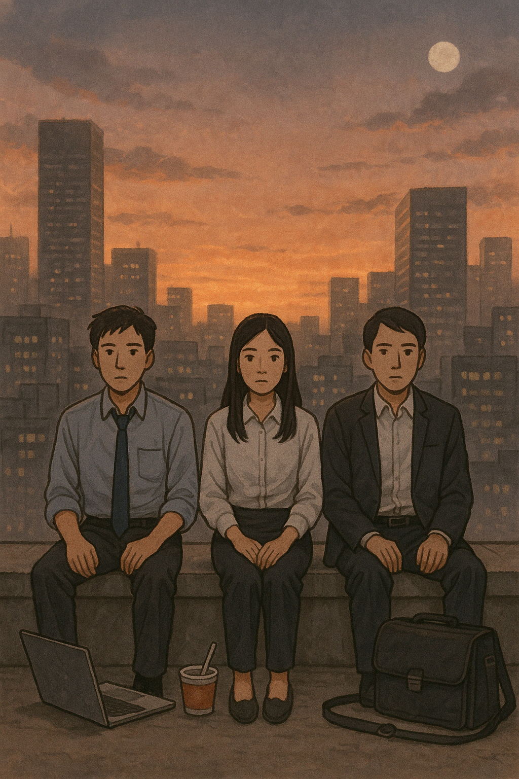 - 🍜 야근 후 편의점 삼각김밥을 먹으며 “우리가 이러려고 대졸했나?” 말하는 장면